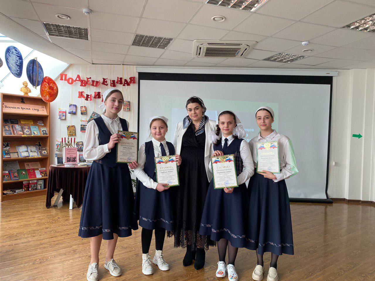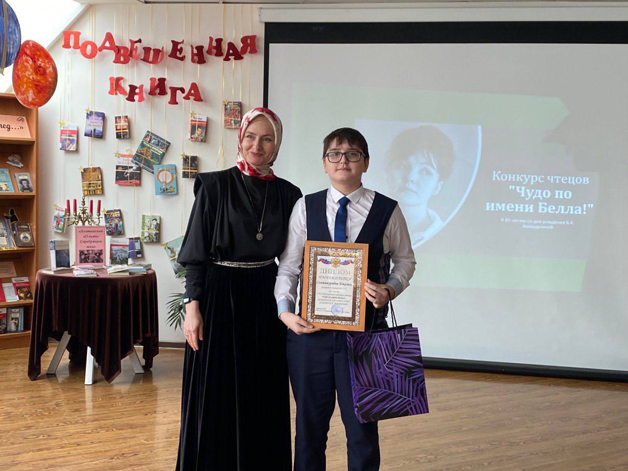 08.04.2022Учащиеся 6-7 класса нашей Гимназии с целью повышения интереса детей и подростков к чтению, расширению их читательского кругозора, поиска и поддержки талантливых детей, приняли участие в Республиканском конкурсе чтецов «Чудо по имени Бэлла!», приуроченном к 85-летию со дня рождения Б. А. Ахмадулиной. Искусство воссоздания в живом слове чувств и мыслей, которыми насыщено художественное произведение, выражения личного отношения исполнителя к произведению было продемонстрировано на высшем уровне. А вернулись наши ребята не с пустыми руками: -Диплом заместо - Солтамурадов Джалил 6 «А» класс; -Диплом за место – Джунаидова Самира 6 «А» класс; Также почётными грамотами награждены: -Заурбекова Медина 6«А» класс -Махмудова Медина 7«Б» класс; -Хайбах Жанни 7«Г» класс Выражаем отдельную благодарность нашим замечательным учителям предметникам Исаковой Бирлант Наврдиновне и Ибаевой Седе Альвиевне за подготовку наших ребят к этому конкурсу