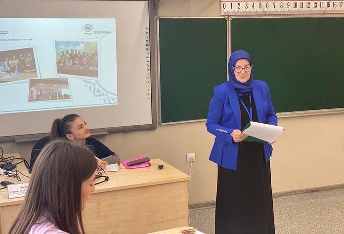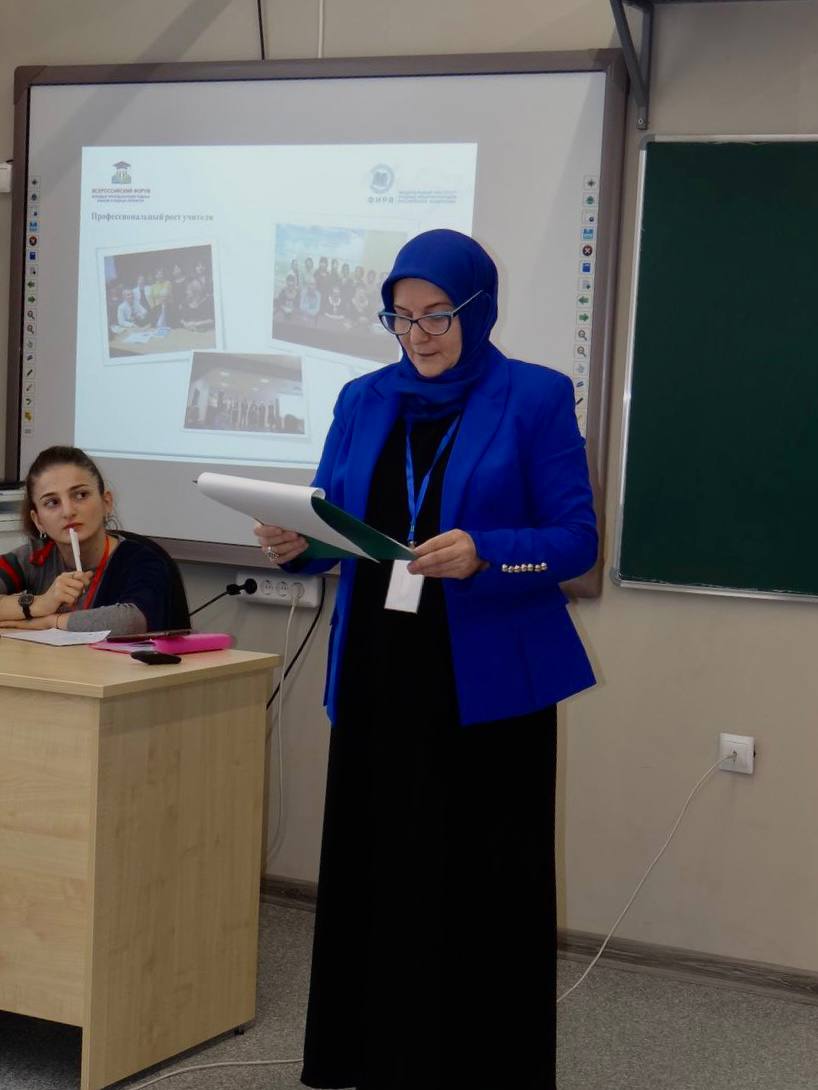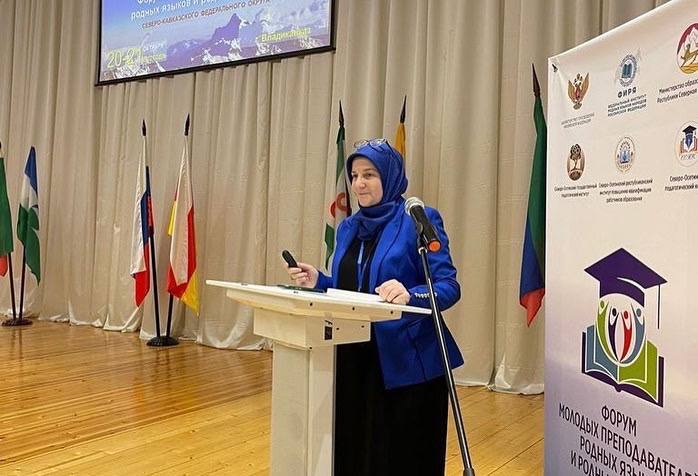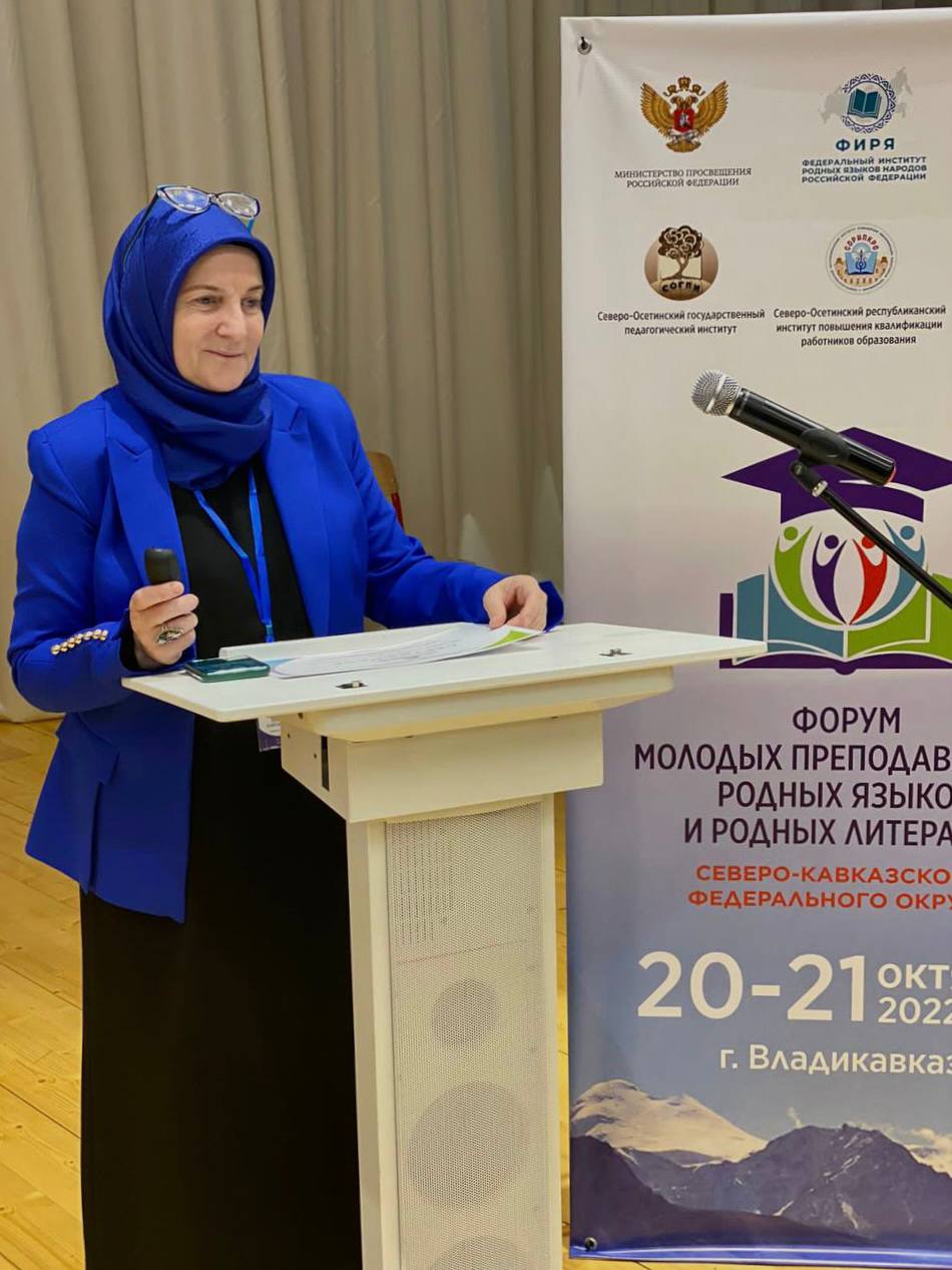 22.10.2022Заслуженный учитель ЧР, учитель чеченского языка и литературы нашей Гимназии Исакова Бирлант Наврдиновна, приняла участие в ФОРУМЕ МОЛОДЫХ ПРЕПОДАВАТЕЛЕЙ РОДНЫХ ЯЗЫКОВ И РОДНЫХ ЛИТЕРАТУР в роли Наставника в г. Владикавказ 20-21 октября. Бирлант Наврдиновна выступила: на пленарном заседании с докладом «Проблемы профессионально-личностного развития молодого учителя в современных условиях и пути их решения»; на секционных занятиях «О роли общественных организаций (Ассоциация учителей) в становлении молодого учителя». Она рассказала о том, что при профессионально-личностном становлении и развитии молодых педагогов родных языков и родных литератур, роль учителя абсолютна и требует постоянного роста, как профессионального, так и творческого. Команда из Чеченской Республики достойно выступила на форуме, и охотно поделилась достижениями в области образования (доклады, мастер-классы), с чем мы их и поздравляем.