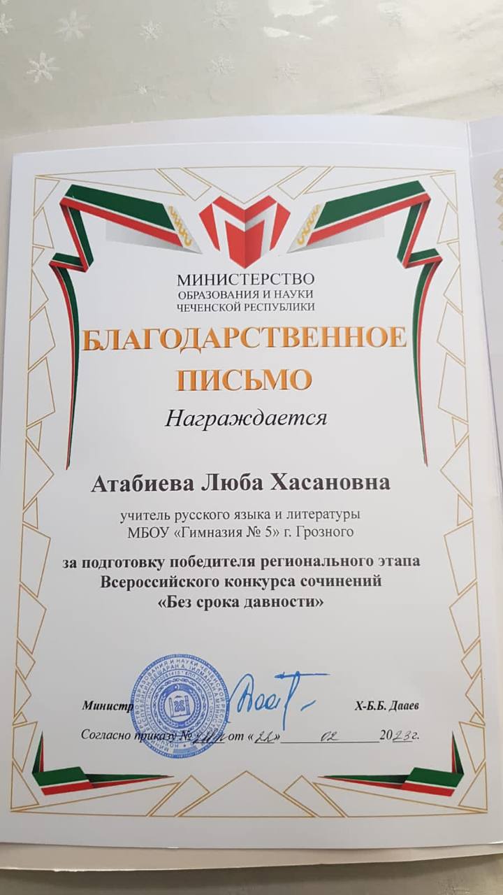 ✨А наш замечательный учитель русского языка и литературы Люба Хасановна награждена Благодарственным письмом за подготовку победителя🤗🌟