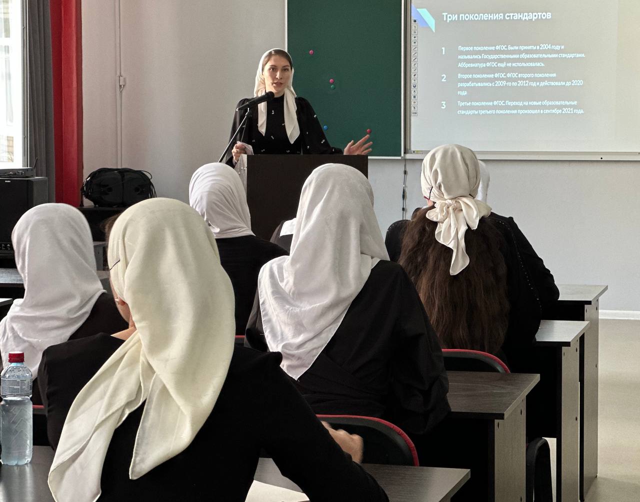 Об основных отличиях ФГОС нового поколения рассказала заместитель директора по КО Яхъяева Луиза Умаровна, а также провела инструктаж по актуальным вопросам введения обновлённых ФГОС и ФООП.