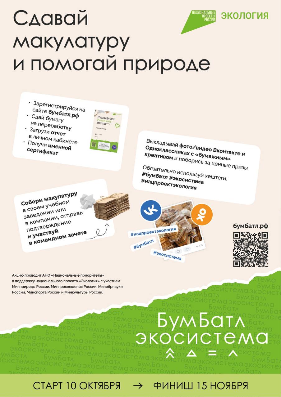 «Акция "БумБатл" традиционно проводится в поддержку нацпроекта "Экология". Присоединиться к проекту может каждый – как самостоятельно, так и в составе организаций. Помощь в сборе и переработке макулатуры проекту окажут представители ключевого регионального оператора. Как и в прошлом году, мы надеемся увидеть в числе участников тысячи воспитанников детских садов, школ, колледжей, вузов, а также представителей частных компаний, заинтересованных в сохранении природных ресурсов», – отметила генеральный директор АНО «Национальные приоритеты» София Малявина.В рамках «БумБатла» волонтеры Всероссийского экологического общественного движения «Экосистема» проведут серию экологических мероприятий в каждом регионе страны. Участники акции будут сдавать макулатуру, что поможет сократить объемы мусорных полигонов и помочь сохранить лесной фонд России. По словам сопредседателя движения «Экосистема» Андрея Руднева, акция привлекает внимание не только ориентированной на охрану окружающей среды молодёжи.