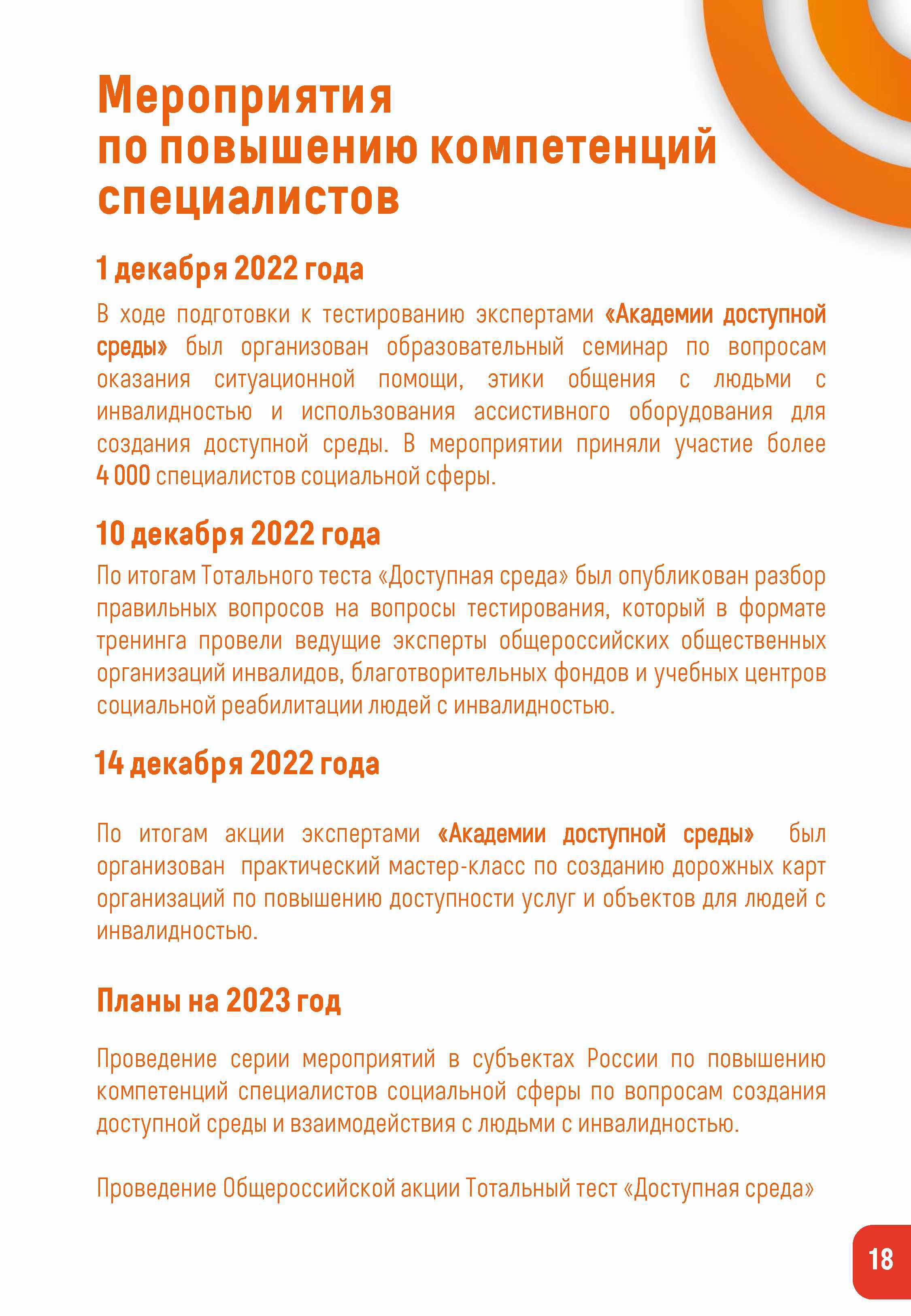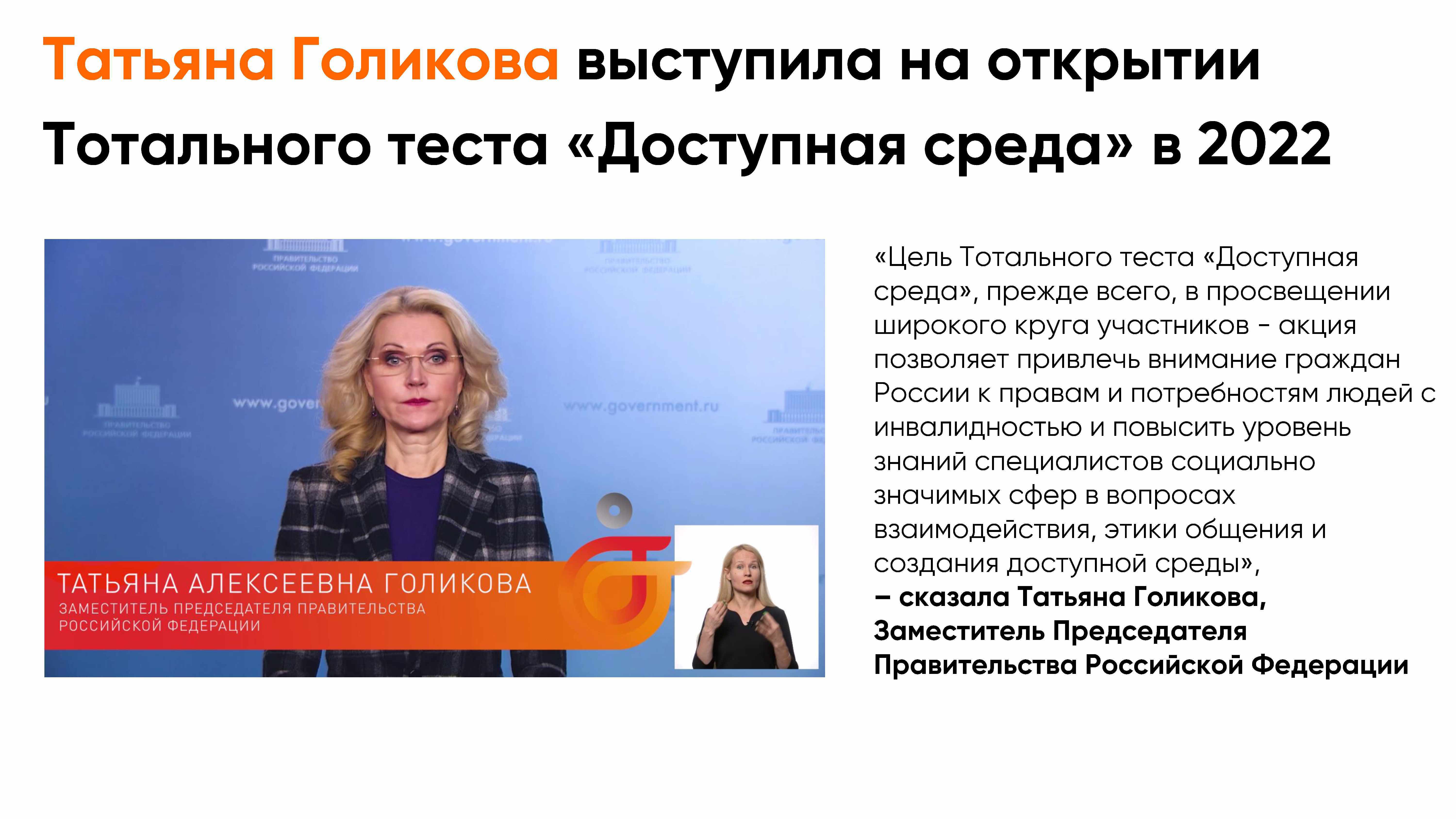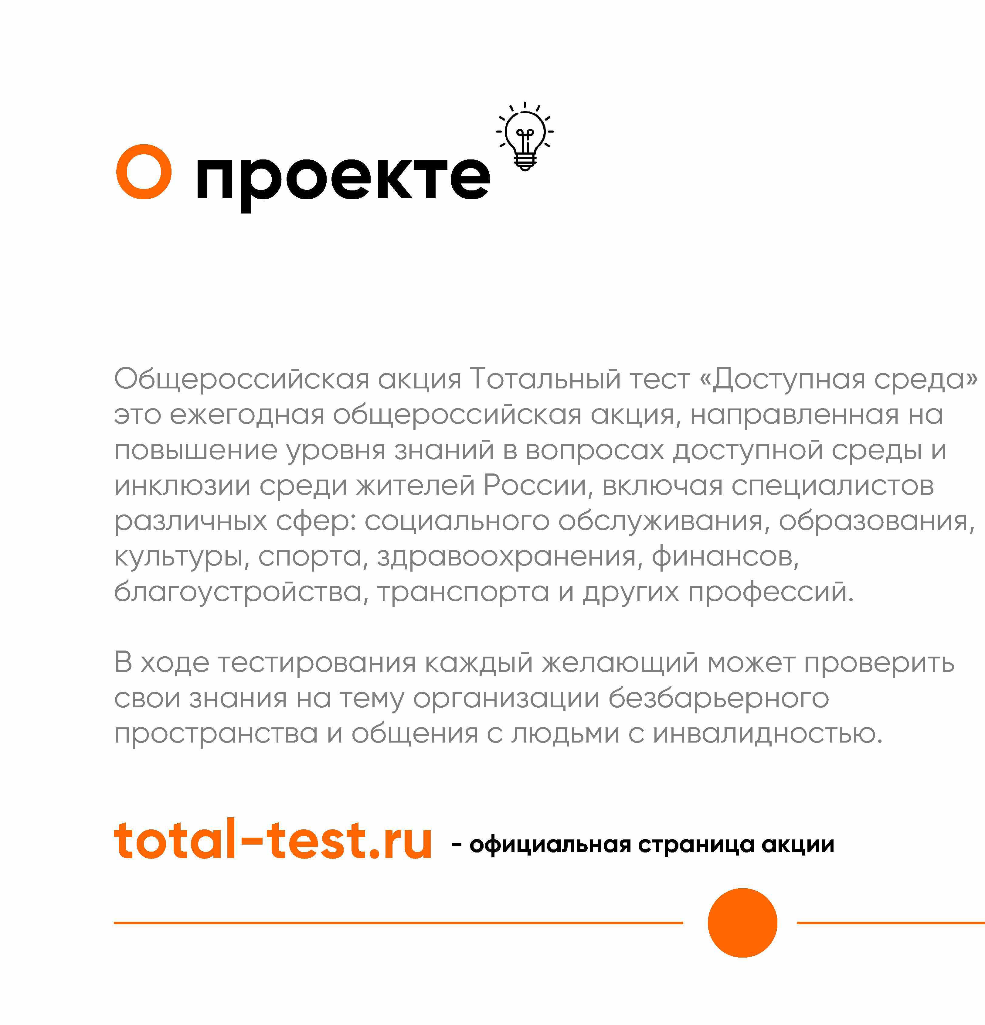 Общероссийская акция «Тотальный тест «Доступная среда» приурочена к Международному дню инвалидов и направлена на привлечение внимания россиян к правам и потребностям людей с инвалидностью.