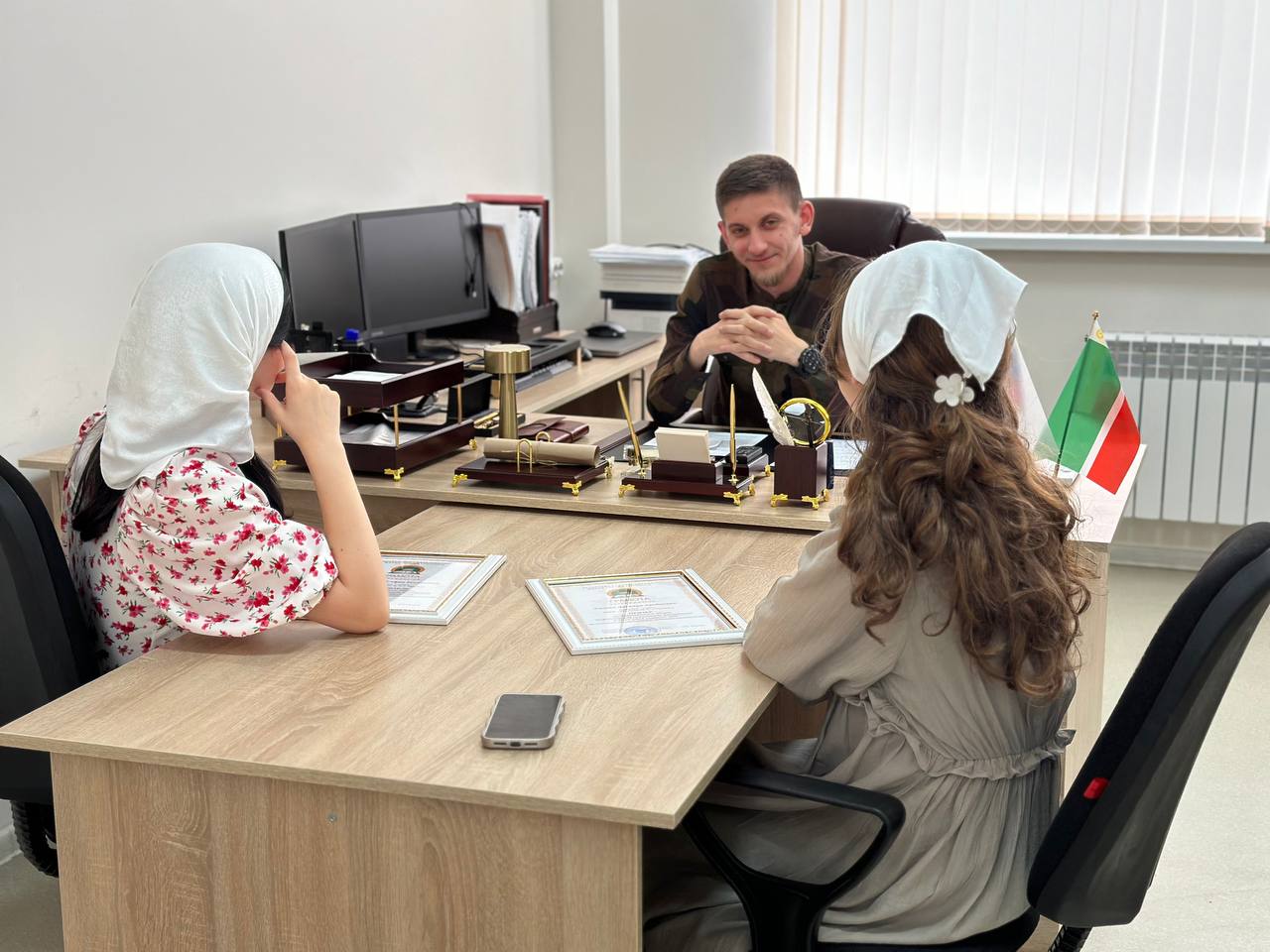 09.08.2024В рамках реализации федерального проекта «Успех каждого ребёнка», являющегося ведущим в составе национального проекта «Образование», разработанного по решению Президента Российской Федерации Владимира Путина, заместитель директора по МР – учитель ОБЗР Гимназии № 5 г. Грозного Мансур Салтукиев, встретился с победителем и серебряным призёром прошедшей ВсОШ – 2024 по ОБЖ и вручил им Почётные Грамоты Департамента образования Мэрии г. Грозного. Мальсагова София (победитель) и Умаева Дагмара (призёр), являются ученицами 8 «Г» класса грозненской 5 Гимназии, помимо этого, ещё и лучшие подруги. Они усердно трудились на протяжении всего учебного года и в итоге забрали все верхние позиции муниципального этапа ВсОШ.