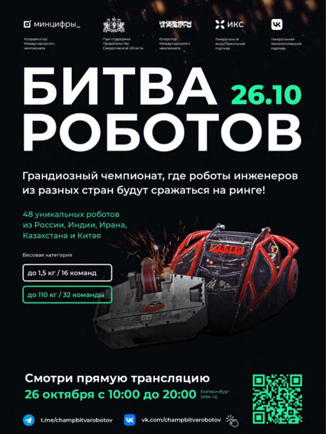 28.10.2024Минцифры России в соответствии с распоряжением Правительства Российской Федерации от 11 апреля 2023 г. № 889-р сообщает о проведении второго отборочного этапа Международного чемпионата по битве роботов , который способствует продвижению инженерной мысли как драйвера развития и поддержки современных цифровых технологий.Второй отборочный этап Чемпионата состоится 26 октября 2024 г. при поддержке Правительства Свердловской области на территории международного выставочного центра «Екатеринбург-Экспо» (павильон № 4) по адресу: г. Екатеринбург, бульвар ЭКСПО-бульвар, 2.Ссылка на прямую трансляцию Чемпионата в сети «Интернет» по адресу: