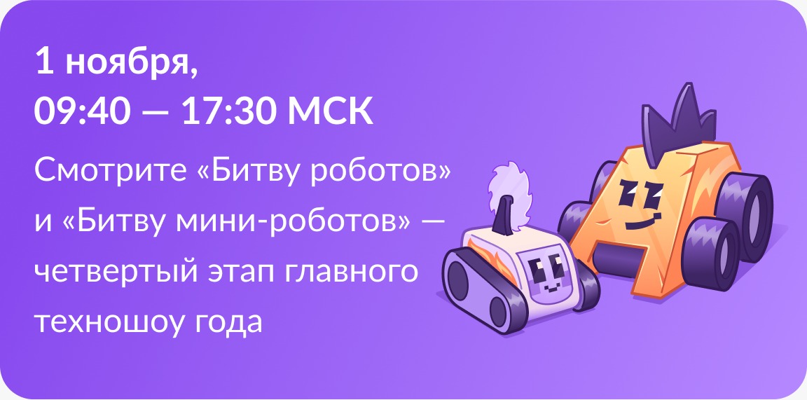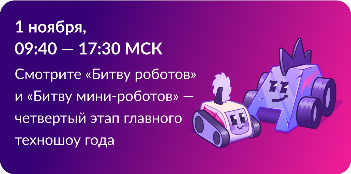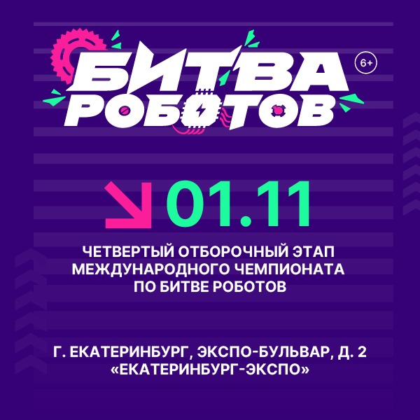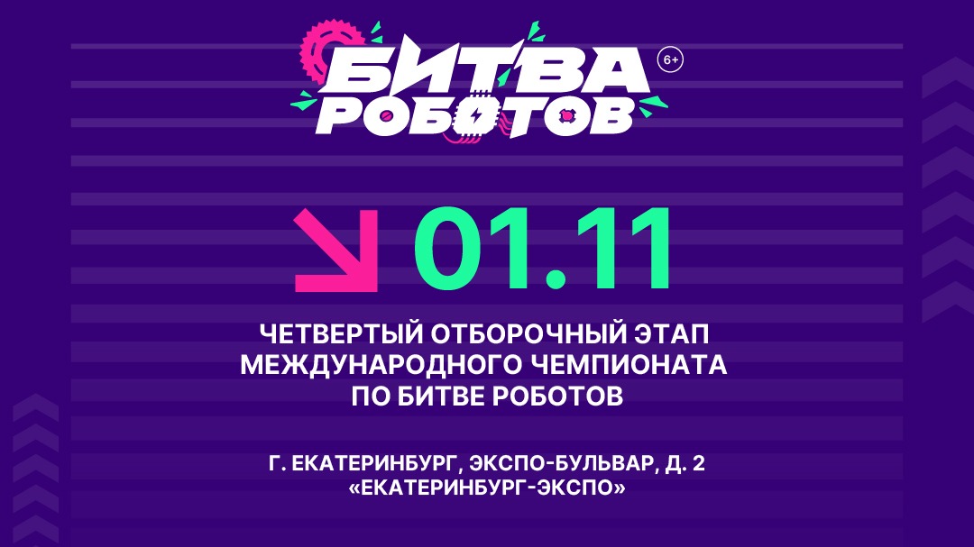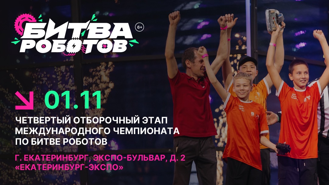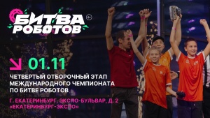 28.10.2025IV отборочный этап международного чемпионата по битве роботов пройдет 1 ноября в Подмосковье, сообщают организаторы чемпионата.Цель чемпионата — популяризация в Российской Федерации инженерной мысли как драйвера развития и поддержки современных цифровых технологий.Три отборочных этапа чемпионата прошли на территории Пермского края, Московской и Ленинградской областей, в которых приняли участие 84 команды со всего мира, из них только 24 команды встретятся в финальном этапе, чтобы побороться за титул чемпиона битвы роботов 2025 года. На текущий момент прямую трансляцию этапов посмотрели более 14 млн человек, свыше 18 тыс. человек посетили отборочные этапы.В четвертом отборочном этапе чемпионата сразятся 28 команд из России, Беларуси, Индии и Китая: 16 команд в рамках дисциплины «Битва роботов» в весовой категории до 110 килограмм и 12 команд в рамках дисциплины «Битва мини-роботов» в весовой категории до 1,5 кг. Среди участников — команды МТУСИ, СПбГУТ им. М. А. Бонч-Бруевича, Высшей Школы Нефти, МИСИС, ИТМО, СППУ Петра Великого, ДГТУ, МИРЭА, НГТУ НЭТИ и других ведущих университетов.Мероприятие пройдет 1 ноября 2025 г. с 11:30 до 19:30 (по местному времени) при поддержке Правительства Свердловской области территории Международного выставочного центра «Екатеринбург-ЭКСПО» по адресу: Свердловская область, г. Екатеринбург, ЭКСПО-бульвар, д. 2.Программой мероприятия предусмотрено два шоу: дневное (с 13:00 до 14:30) и вечернее (с 18:00 до 19:30).Прямую трансляция Чемпионата по ссылке: